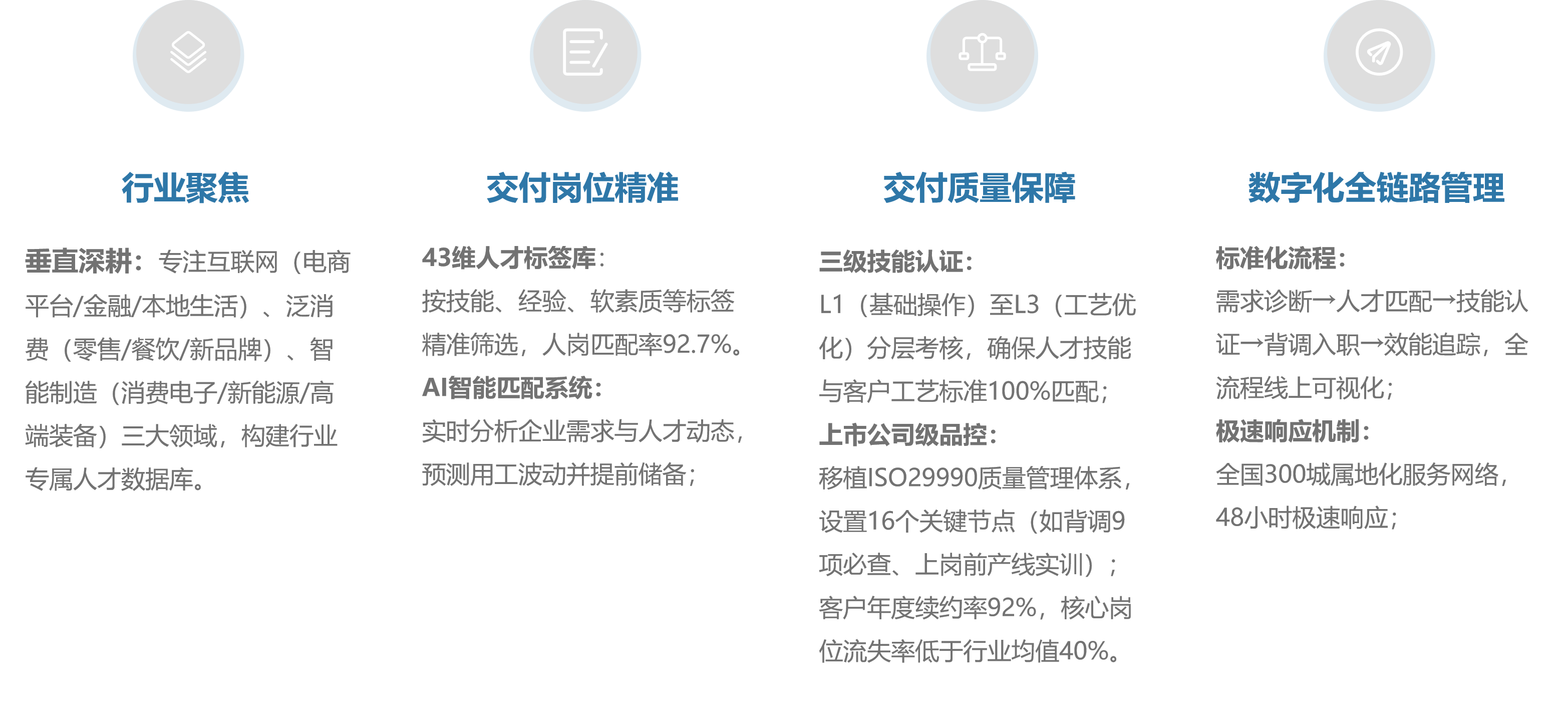 针对互联网技术岗、智能制造蓝领工程师、泛消费区域管理岗等岗位,提供从需求分析、人才寻访到背调入职的全流程服务